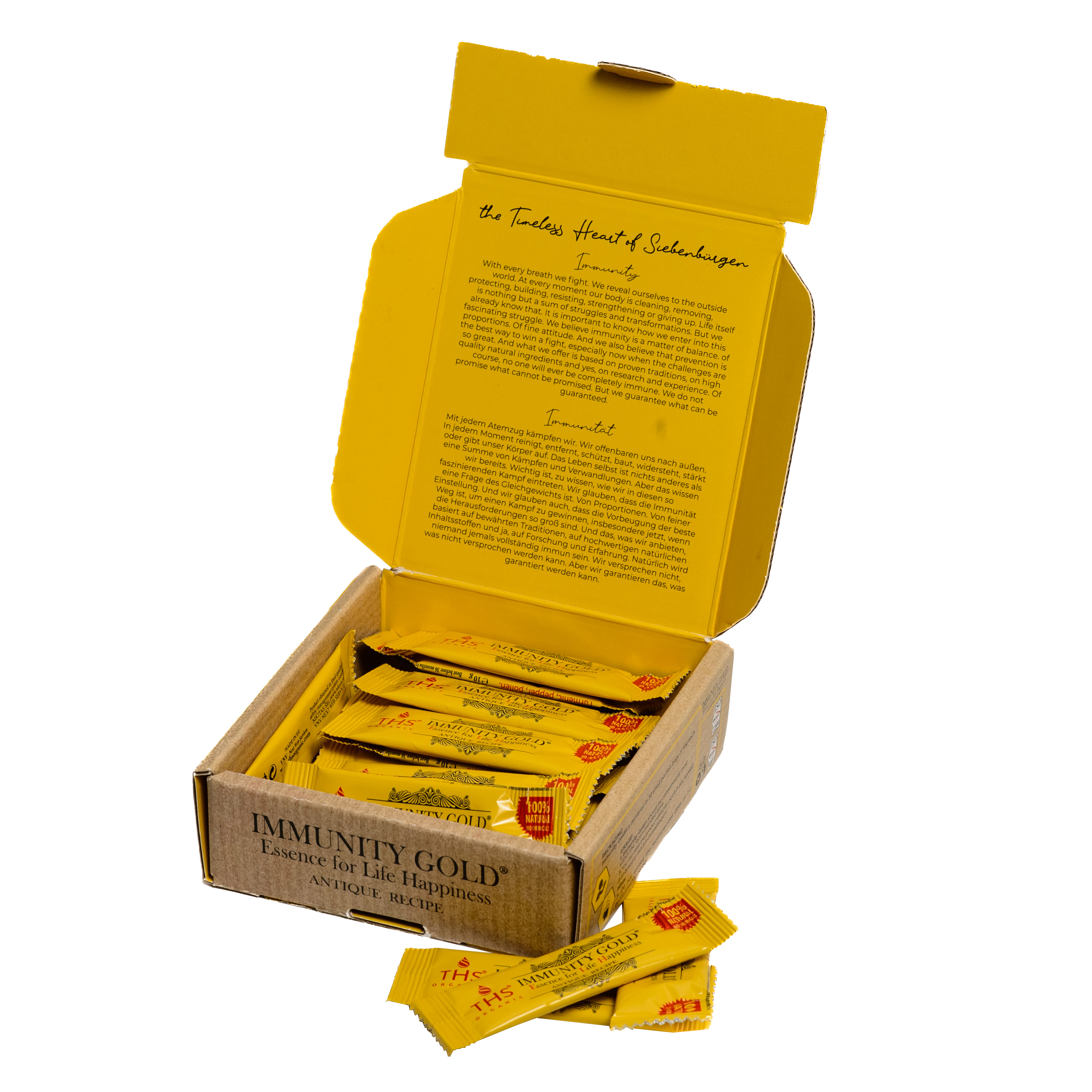 Ambalat în pliculețe monodoză, Immunity Gold® este ușor de transportat și simplu de administrat — ideal pentru programe aglomerate sau pentru călătorii. Una sau două porții pe zi oferă o dozare flexibilă, adaptată nevoilor tale de sănătate.