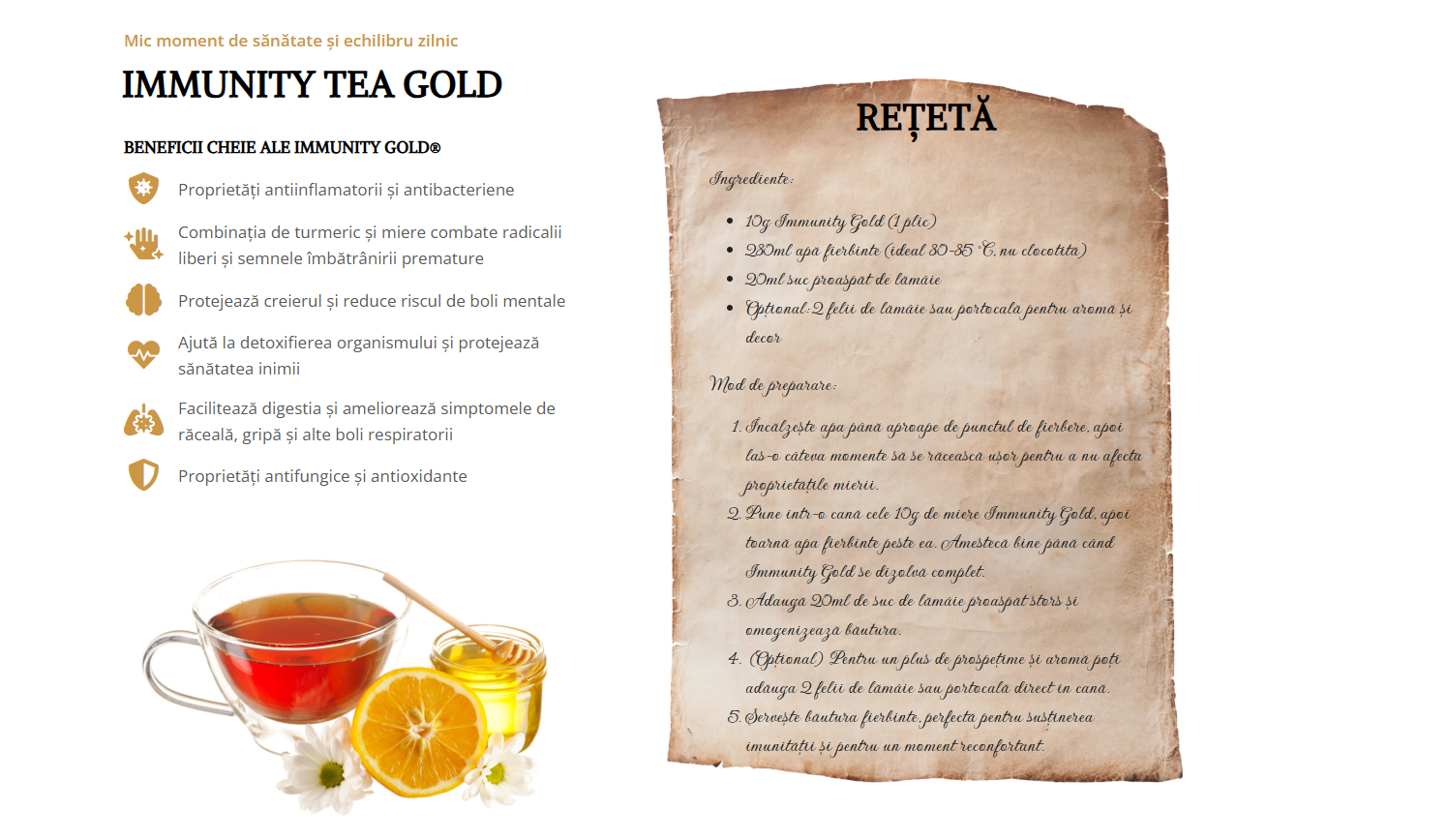 Immunity Gold este un supliment natural pentru imunitate, creat pentru a sprijini mecanismele naturale de apărare ale organismului. Formula sa combină ingrediente atent selecționate, precum turmericul și mierea, recunoscute pentru proprietățile lor antioxidante și de susținere a echilibrului general al corpului.